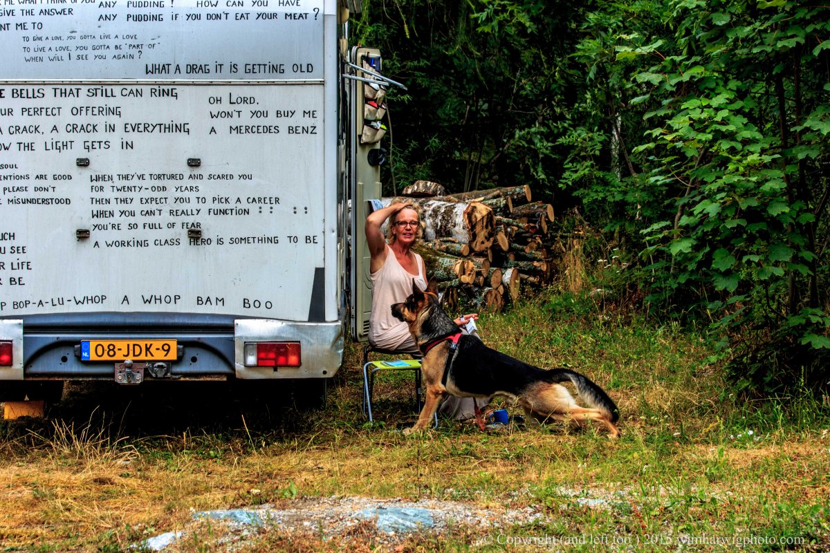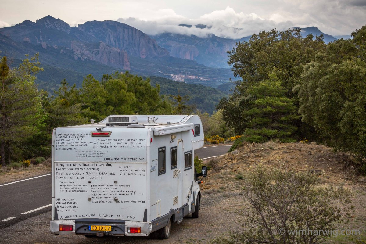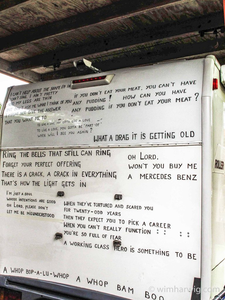 I decided to make the white camper/motorhome look a bit less like an aggressive vehicle with which tourists normally invade the beautiful areas of Europe. So I thought: Let me not write the names of bands, but refer to them by means of lyrics … curious if people recognize only the lyrics and can add a name to it.