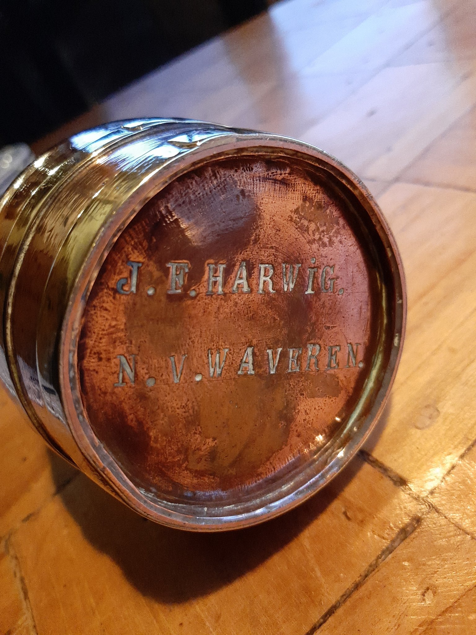 This is an old ashtray that my grandparents Jan Frederik Harwig and Neeltje van Waveren got from his brother. His brother emigrated to the promised land “the United States of America” at the beginning of the last century. As a parting gift he made a number of copper ashtrays, as a reminder.
